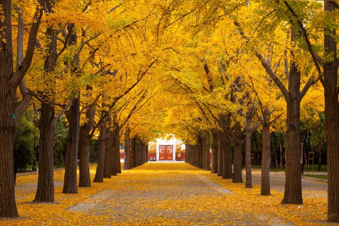 在北方,有一个被誉为“中国最美银杏村落”的地方——甘肃陇南徽县嘉陵镇田河村,10月中旬这里就进入银杏最佳观赏期,百余株千年银杏以最灿烂的姿态,将整个村落染成一片温暖的金黄。在辽宁鞍山千山景区,今年举办了千山银杏节,并标记出多个特色打卡点,游客10月下旬就可以沉浸式感受银杏的魅力。陕西西安古观音禅寺的古银杏至今已有1400多年,10月底也渐入佳境,从大殿门口望向银杏树,红墙、飞檐与金黄的树冠同框,随手一拍就是兼具古风与禅意的大片。