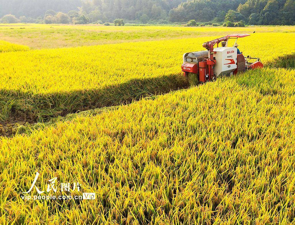 金秋十月,江西省上饶市婺源县中稻进入收获季,农民在田间地头抓紧收割稻谷,一派丰收景象。胡敦煌摄(人民图片网)